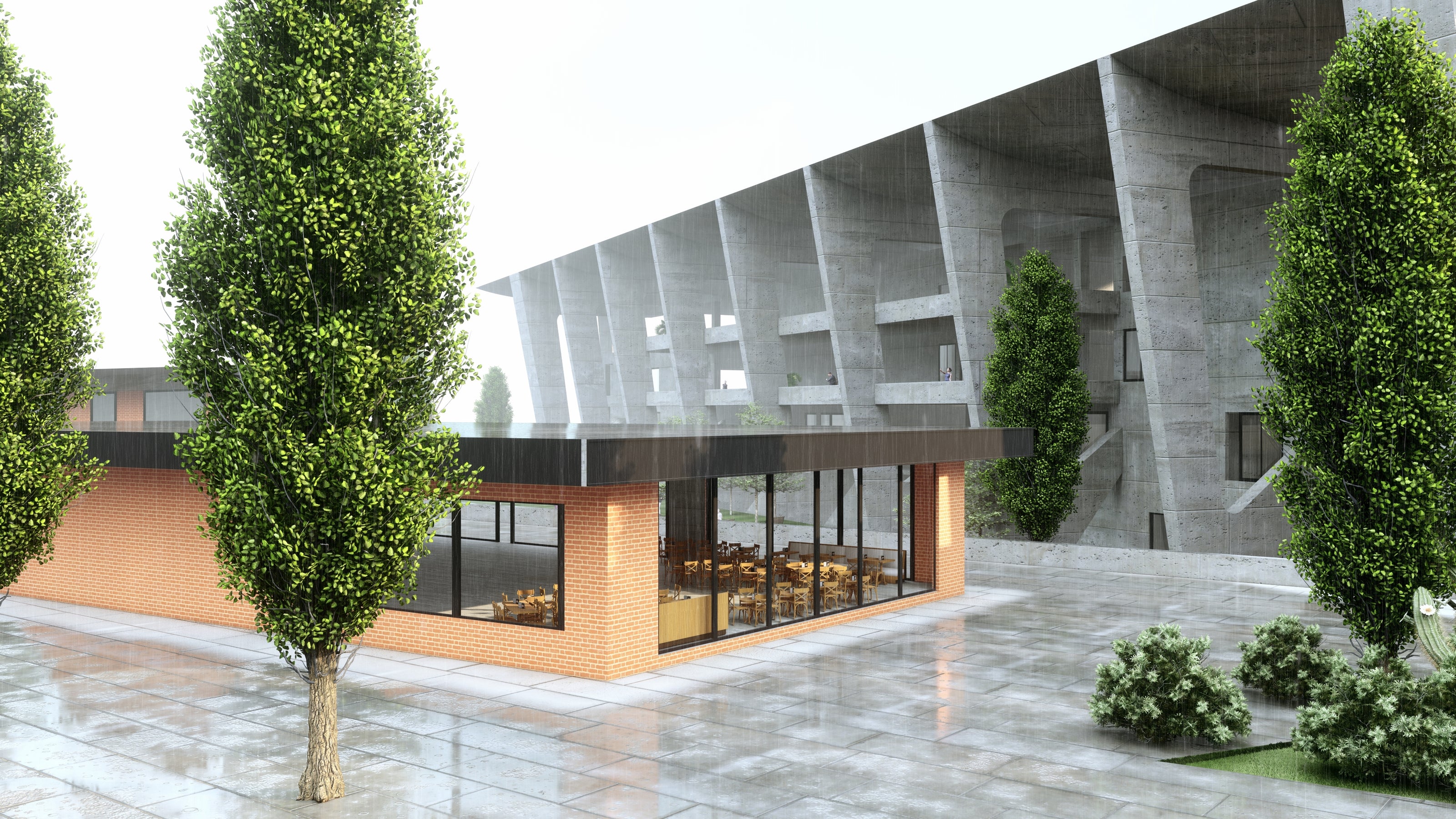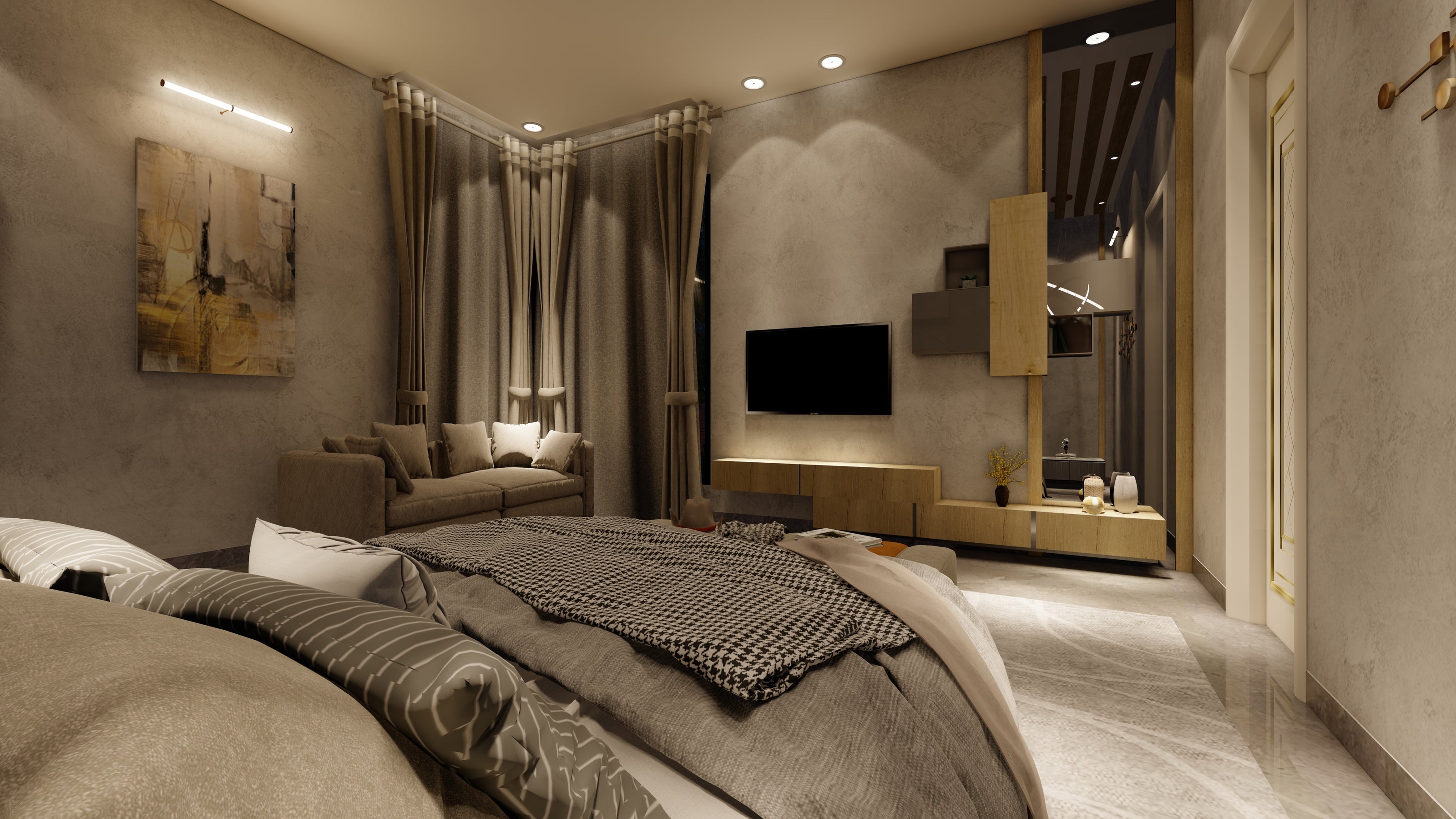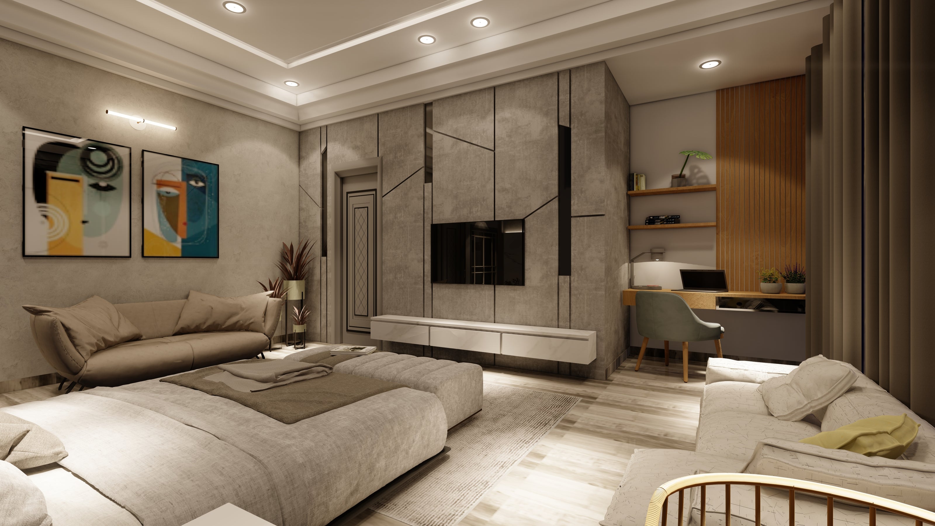 Interior with modern lines. Play with natural stone with concrete finishes along with natural wood.
